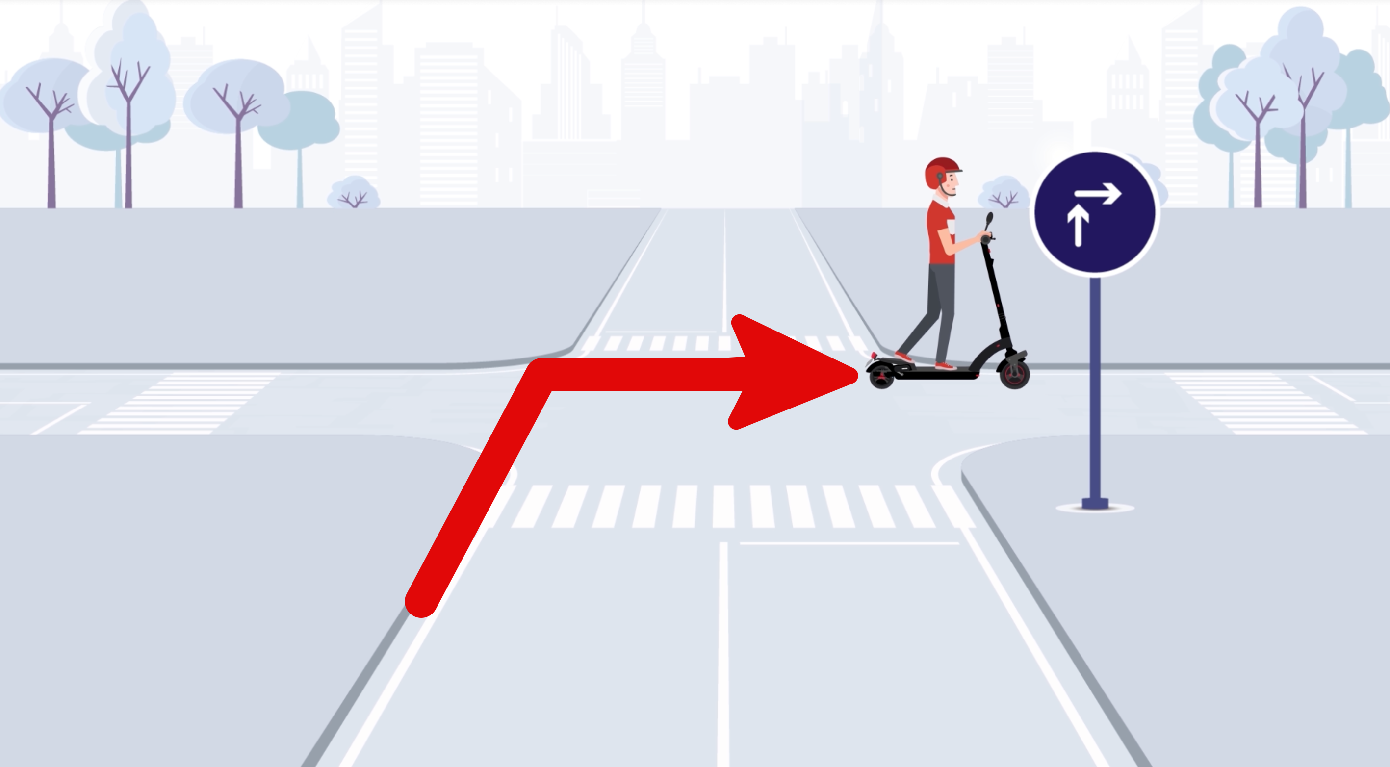 ややこしいですが、電動キックボードは基本的に二段右折が必要で、標識によっては小回り右折する場合もあります。