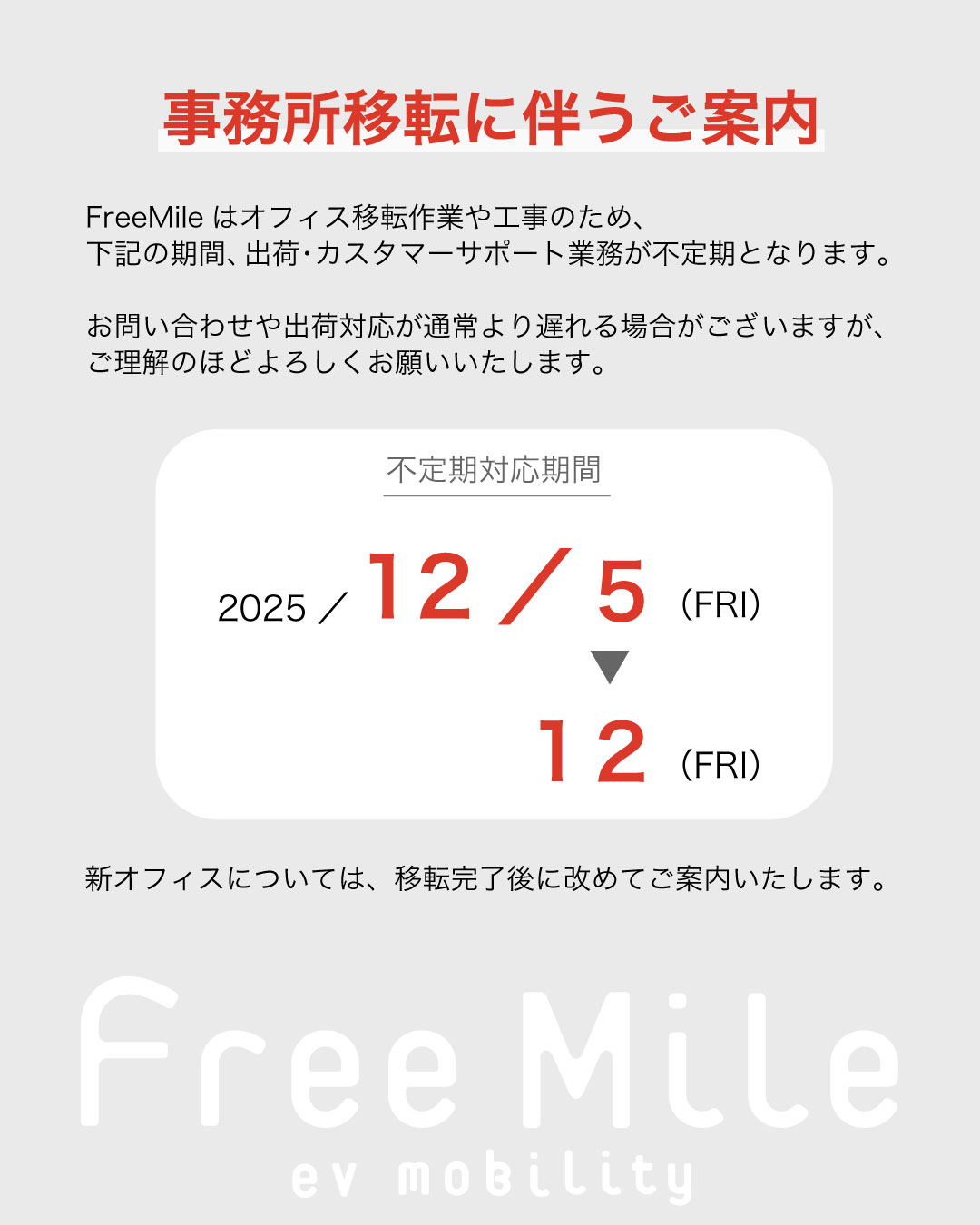 FreeMile株式会社は、オフィス移転作業および工事に伴い、