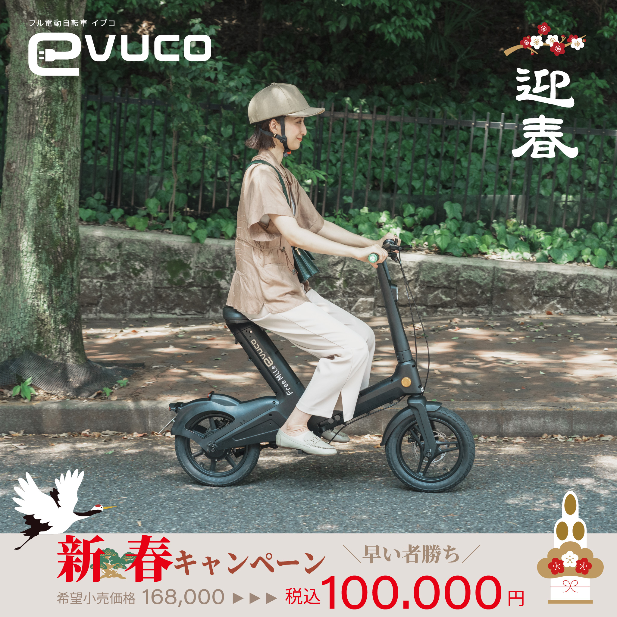 免許不要(特定小型原付区分)のフル電動自転車「evuco(イブコ)」は、新春キャンペーンとして通常本体価格16万8,000円(税込)のところ10万円(税込・送料別)で販売し、1月13日の開始後に限定15台が即完売しました。